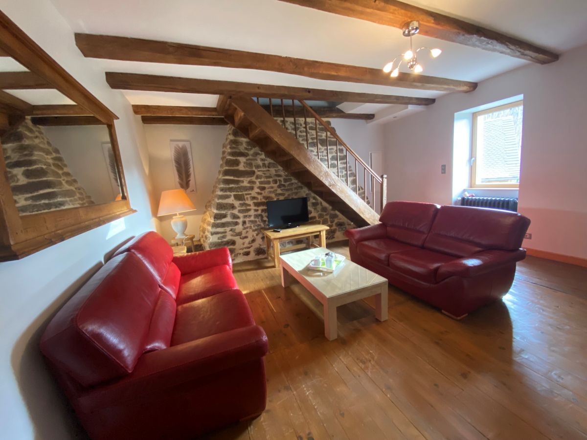 Le coin repos équipé d’un canapé d’angle avec fauteuil, écran plat, lecteur DVD du côté du grand conduit de cheminée tout en pierre est le reflet du mélange rustique moderne qui caractérise les lieux. Depuis cet espace, vous pourrez sereinement découvrir les livres et la documentation touristique mis à votre disposition.