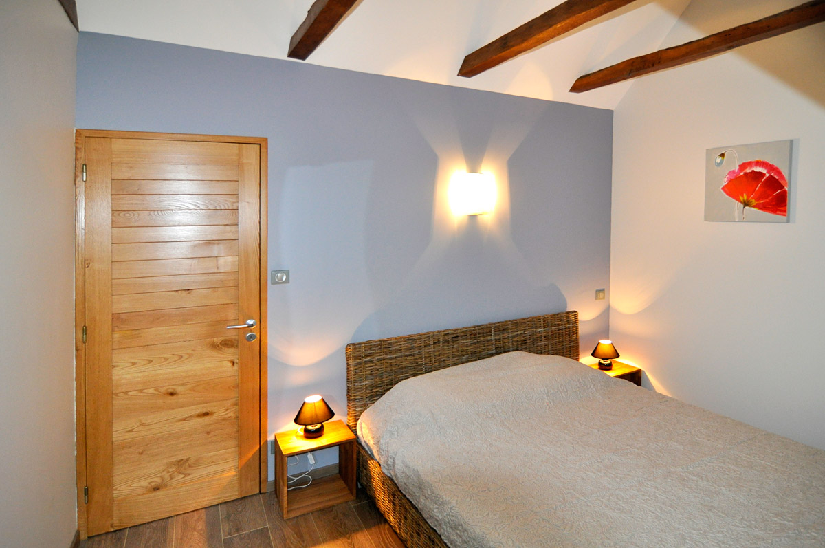Les belles pièces de charpente ont été conservées apparentes et mises en valeur dans chacune des chambres lumineuses au volume confortable.